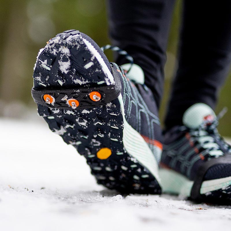 Snöbroddarna kräver lite fingerfärdighet att få på första gången, men det flexibla gummimaterialet gör att de sitter tätt och stabilt runt skon när de väl är monterade.
