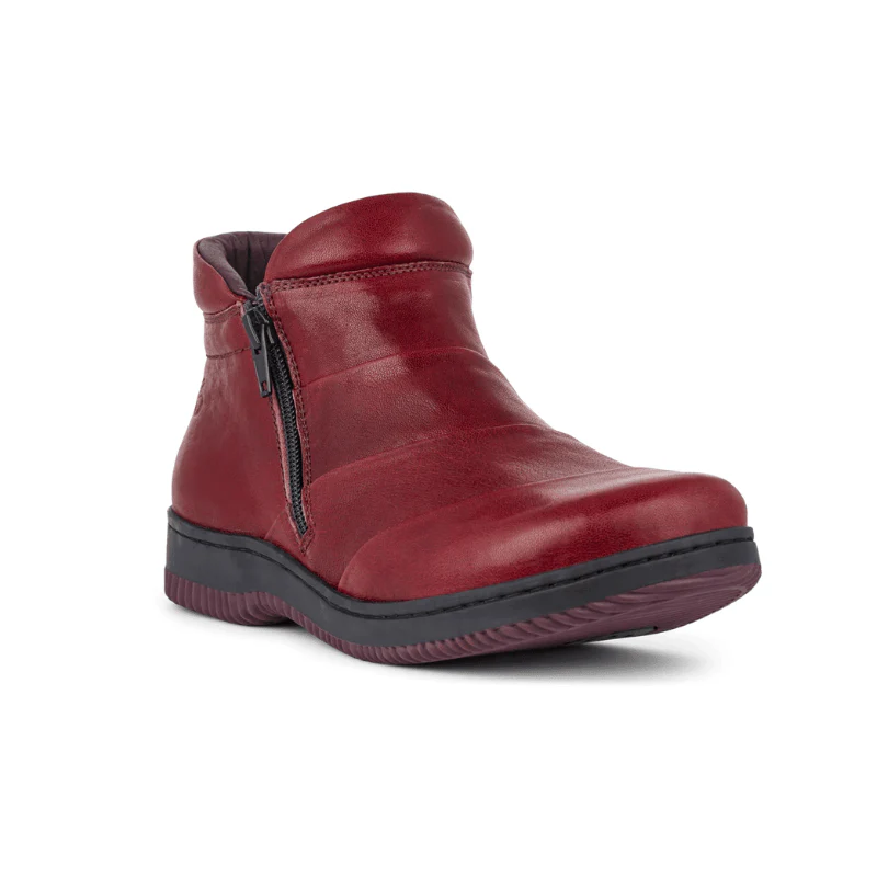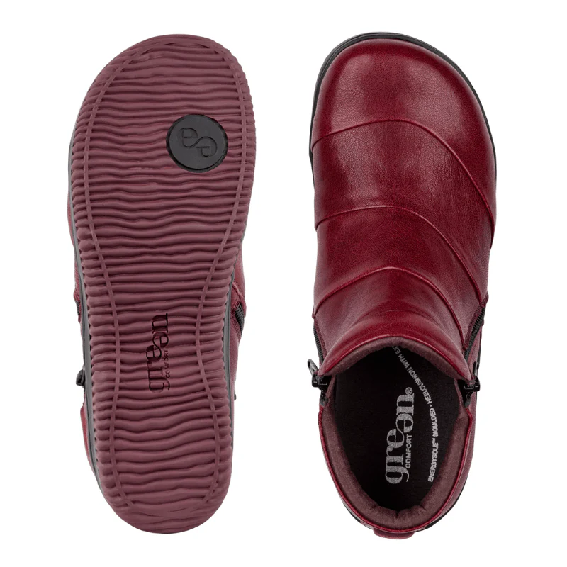 Låg bordeauxfärgad läderkänga från Green Comfort med två praktiska dragkedjor som gör den enkel att ta av och på, medan de fina sömmarna ger ett modernt och elegant uttryck. Den mönstrade gummisulan garanterar ett bra och säkert grepp – oavsett väder och underlag.