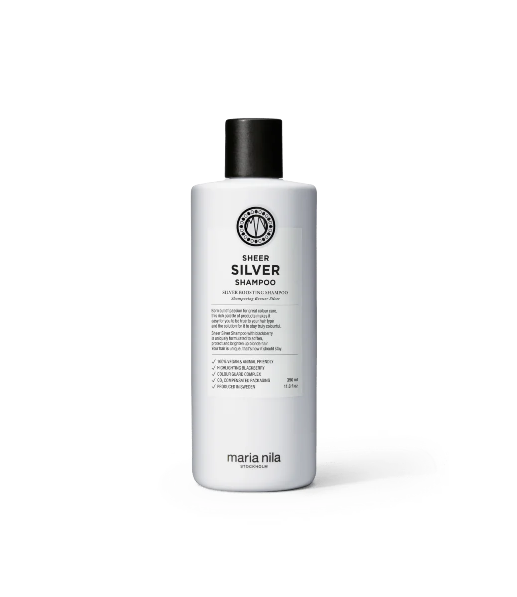 Maria Nila Care & Style Sheer Silver Shampoo 350 ml: Ett silverschampo som innehåller violetta pigment och björnbärsextrakt som neutraliserar guldiga toner i blont hår samtidigt som det stärker hårets struktur. Björnbärsextraktet framhäver hårets naturliga slingor och ger mer glans. Sheer Silver Shampoo har en frisk blommig doft med inslag av jasmin, apelsin och grapefrukt. Färgbevarande Colour Guard Complex skyddar ditt hår mot UV-strålning och fria radikaler.